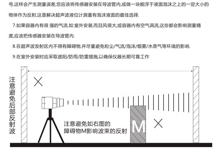 由于超聲波傳感器探頭發(fā)射的超聲波有一定的波束角,因此聲波輻射區(qū)域內(nèi)不得有障礙物。在安裝時(shí),應(yīng)盡量避開(kāi)罐內(nèi)設(shè)施,如人梯、限位開(kāi)關(guān)、加熱設(shè)備、支架等,以確保超聲波能夠順利發(fā)射并反射回來(lái),從而保證測(cè)量結(jié)果的準(zhǔn)確性。